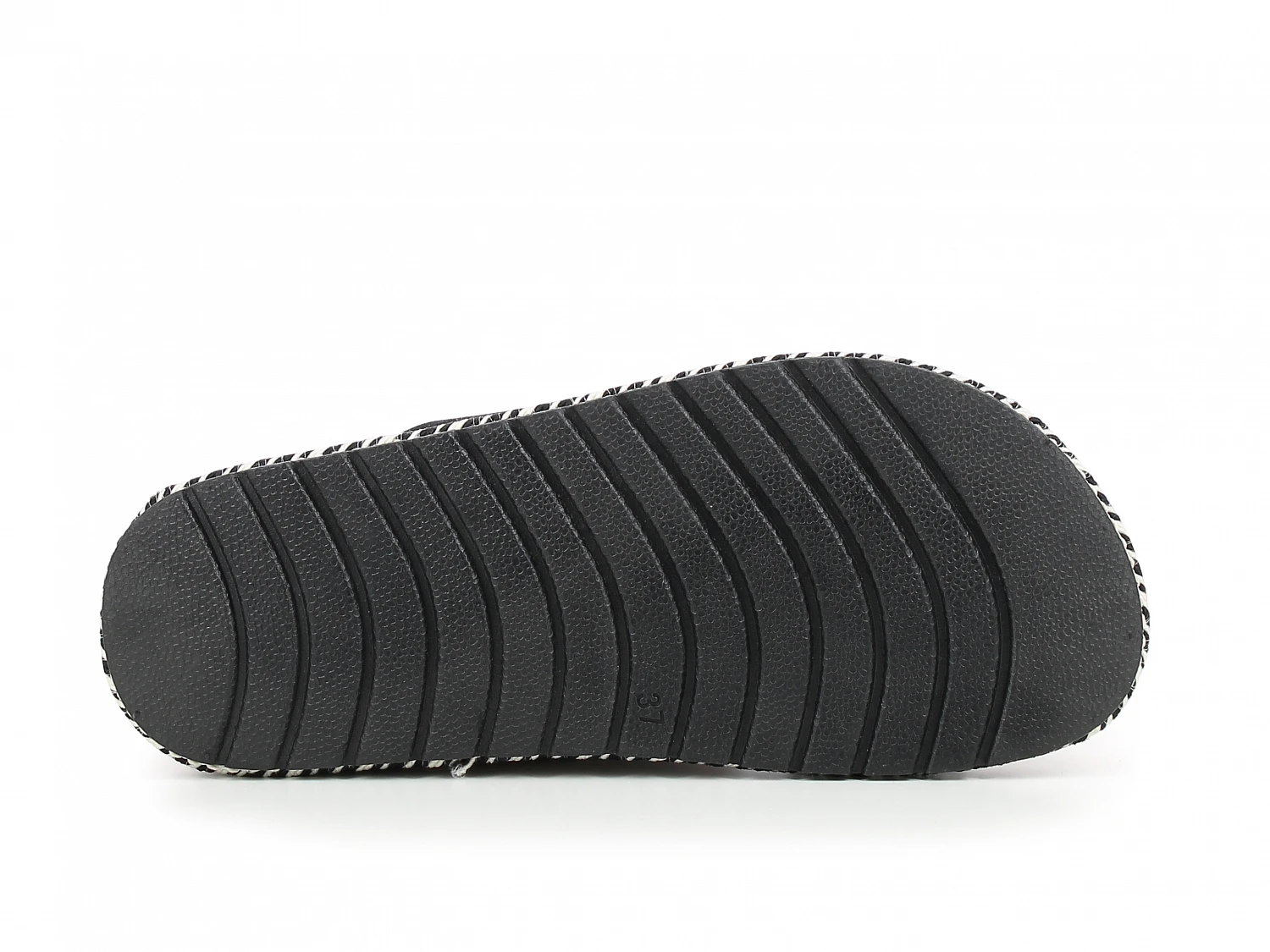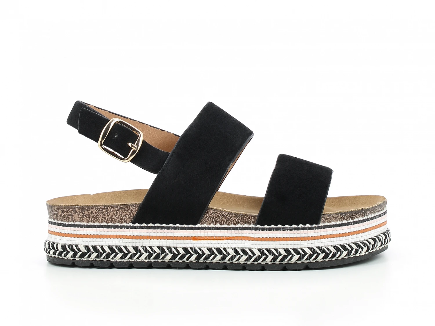 Trendy Sandal med sorte stropper og mønstret pltåsåle.