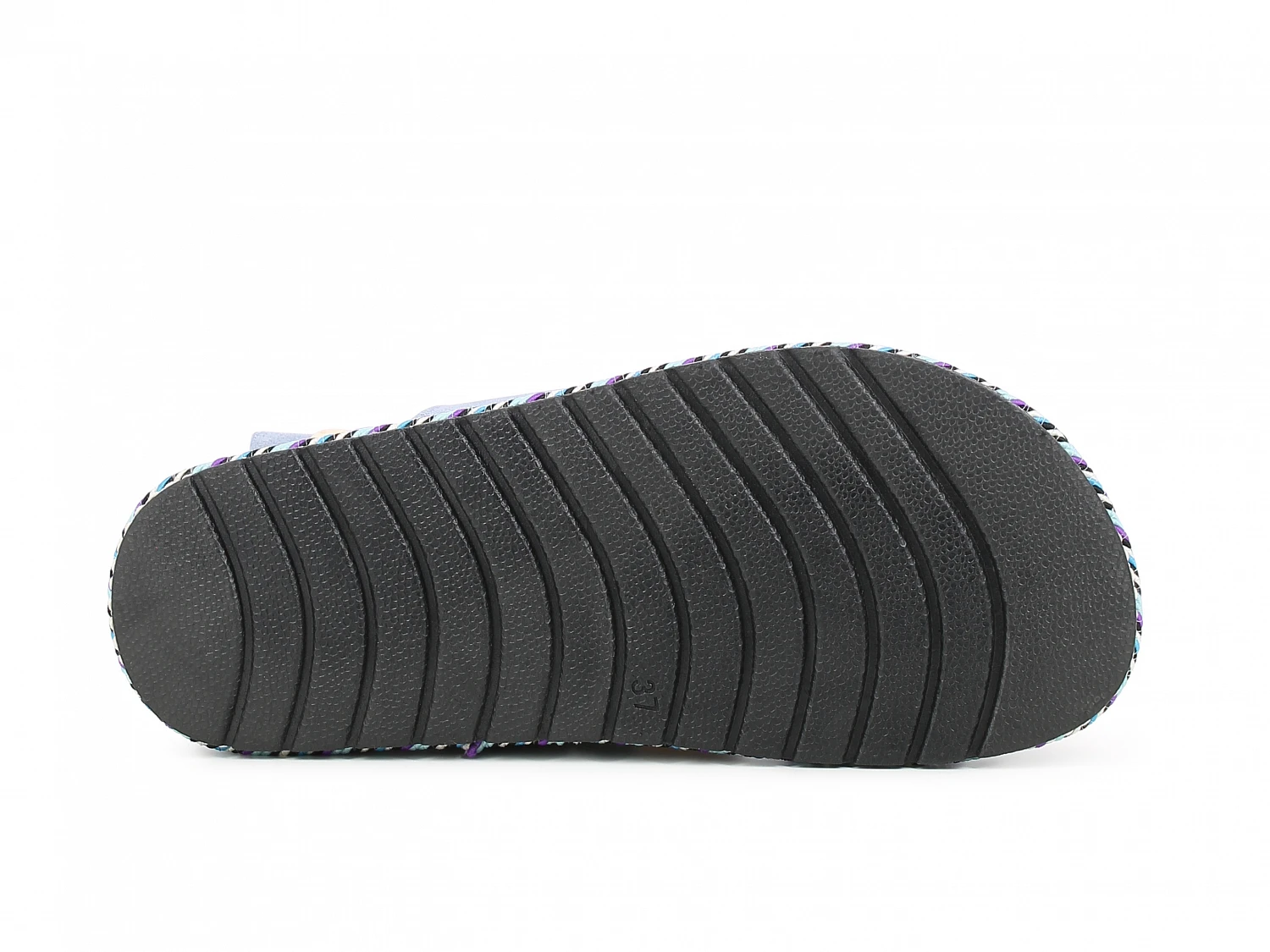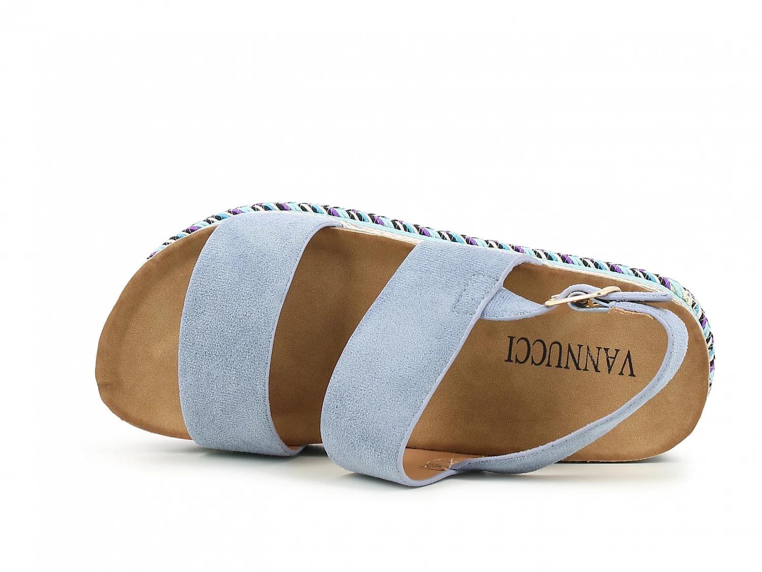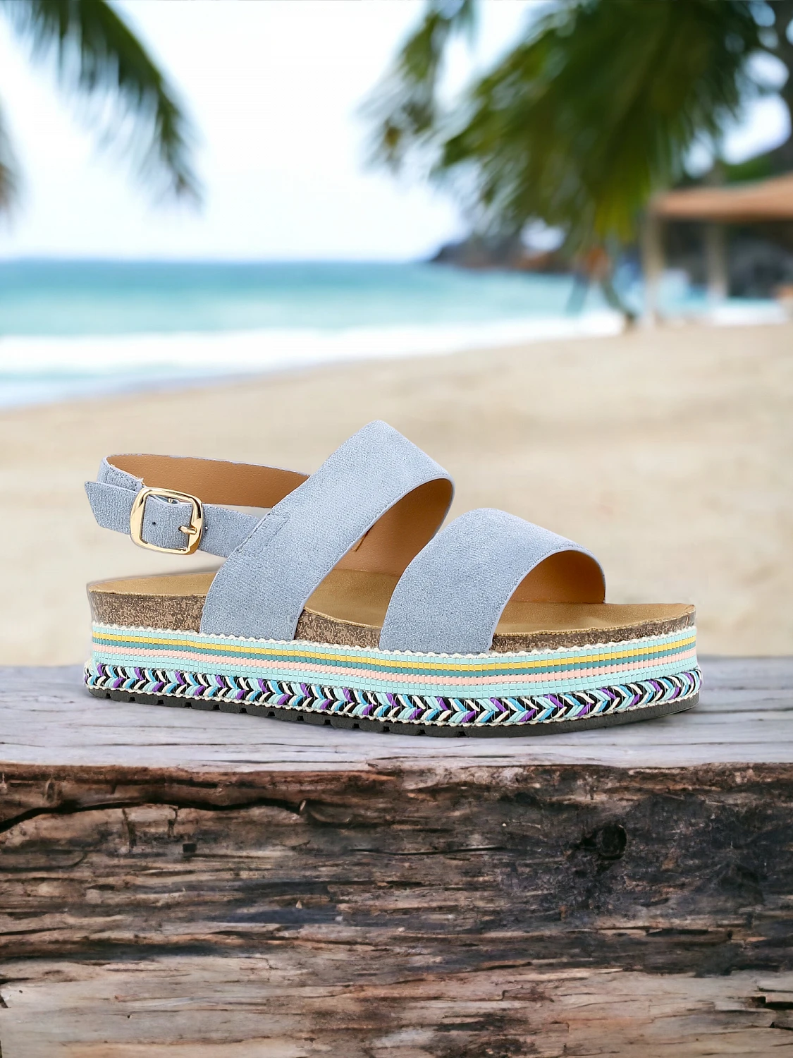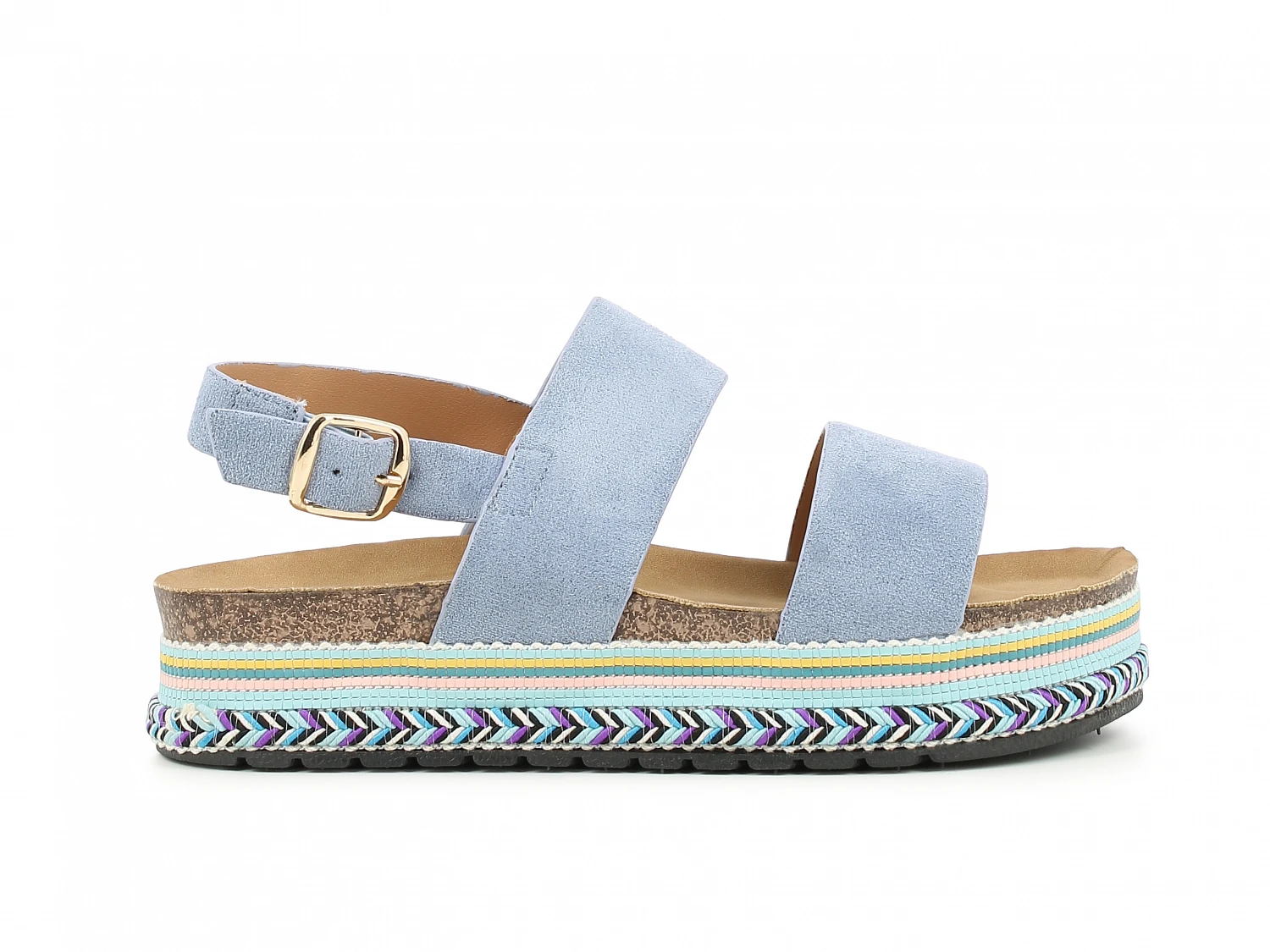 Trendy platåsandal med blå remmer og mønstret såle.