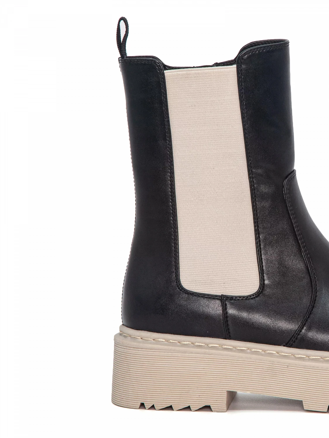 Støvel med grov såle, overdel i syntetisk materiale, strikk på utsiden og innvendig glidelås, mykt fleecefôr. Skafthøyde 18 cm