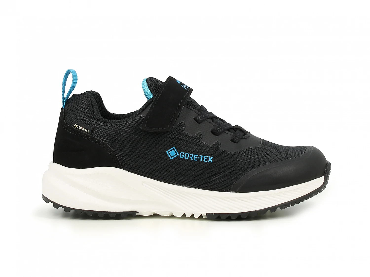 Praktisk vanntett Gore-tex sneakers i sort med blåe detaljer. Borrelås for at barna kan enkelt ta den av og på.