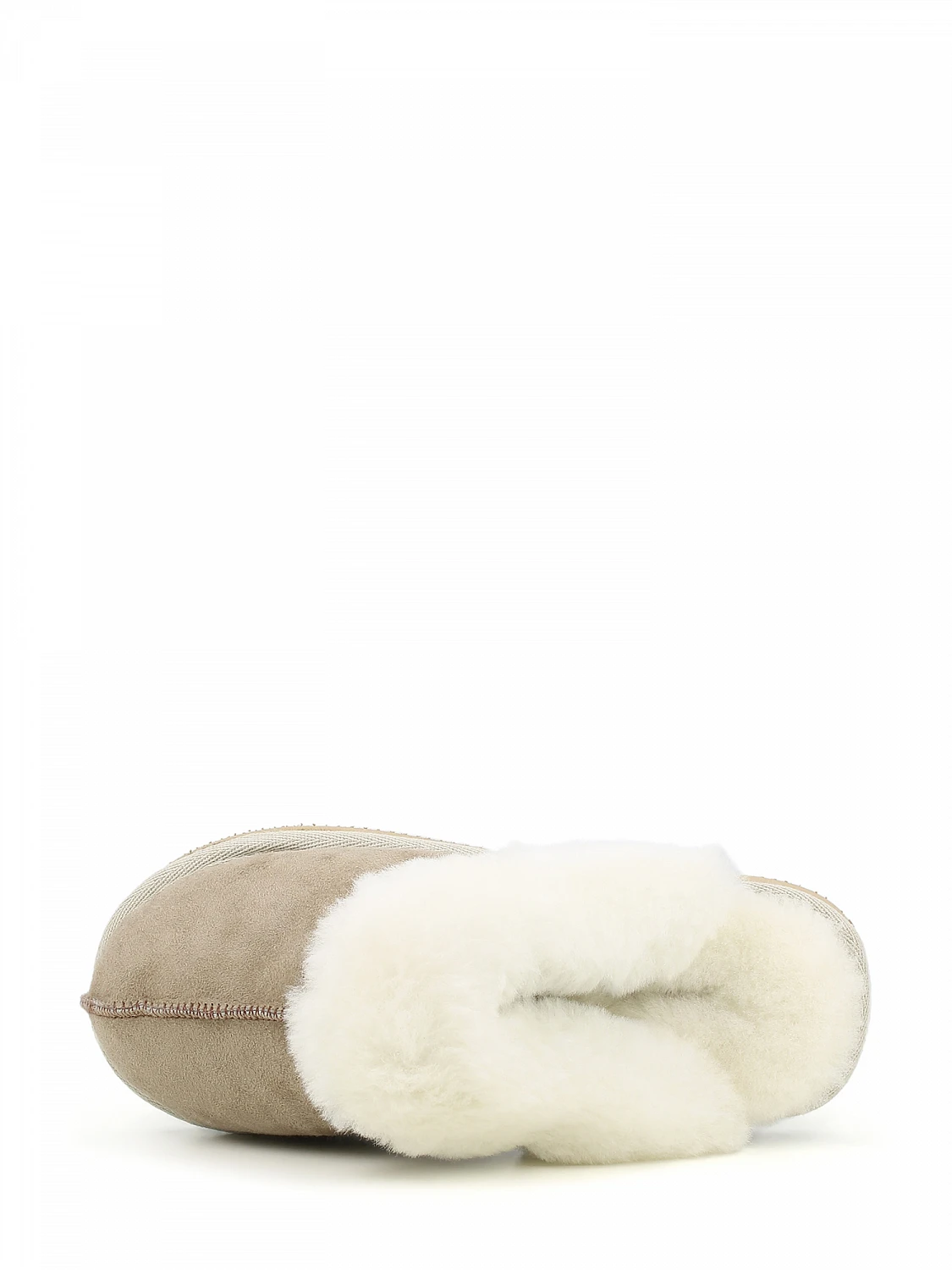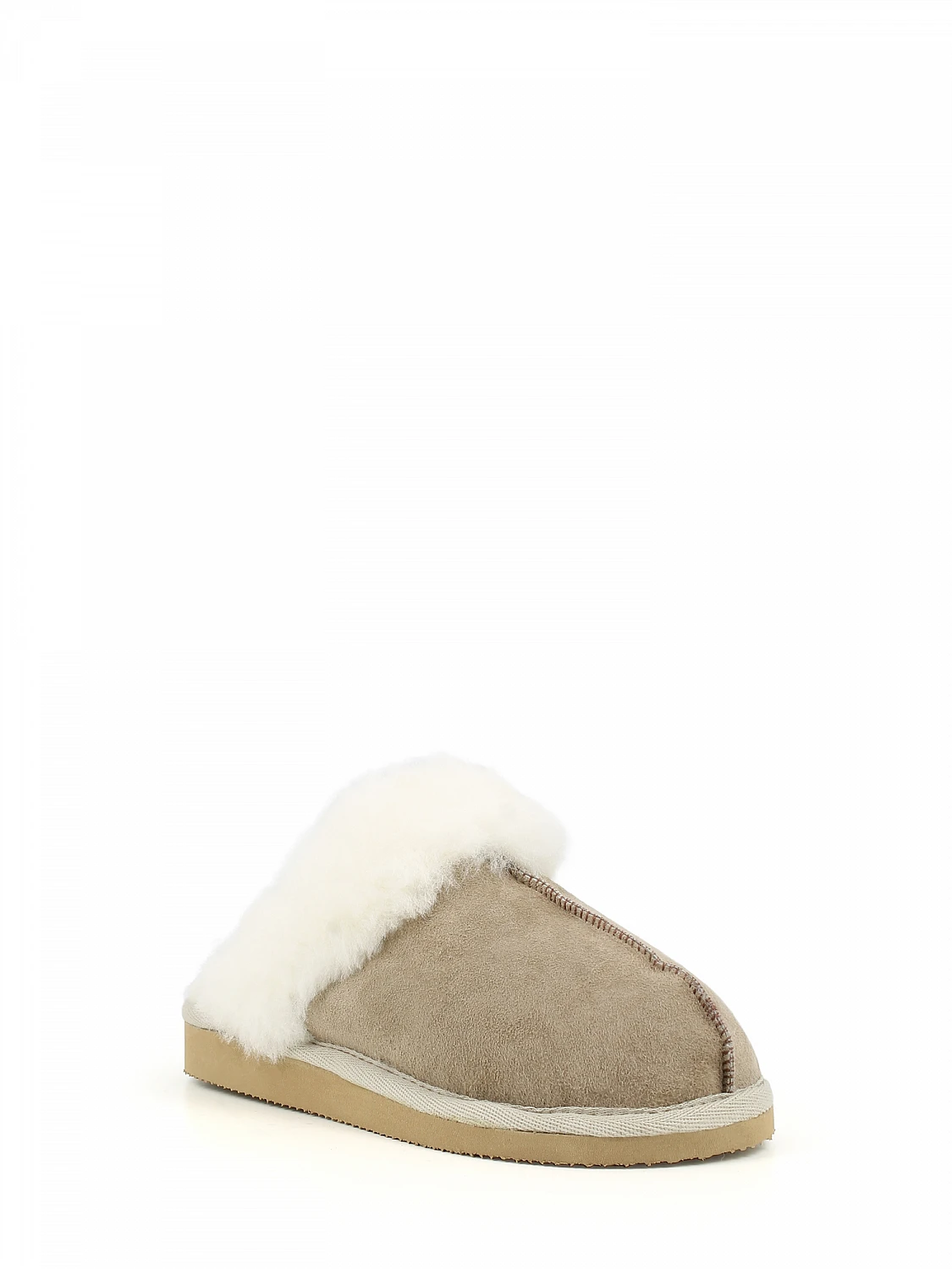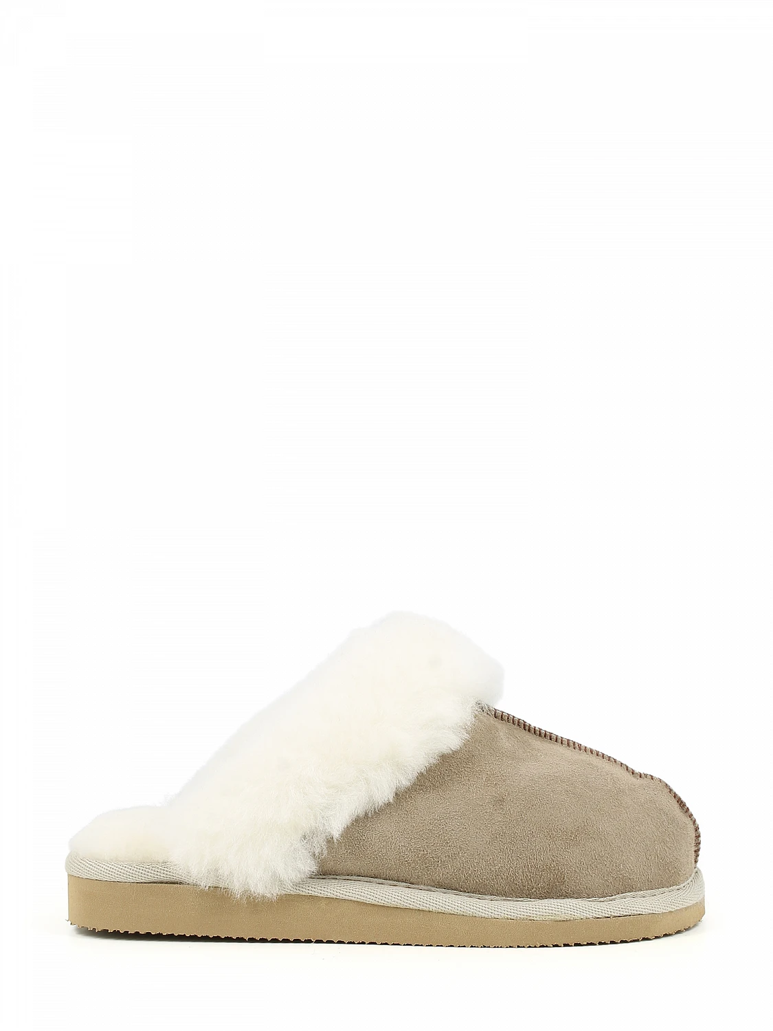 Shepherd Jessica. Myke og varmende slip-in saueskinntøfler for kvinner. Tøflene har bred saueskinnskrage, dekorative sømmer foran og stoffbinding rundt sålen. Yttersålen er laget av EVA.