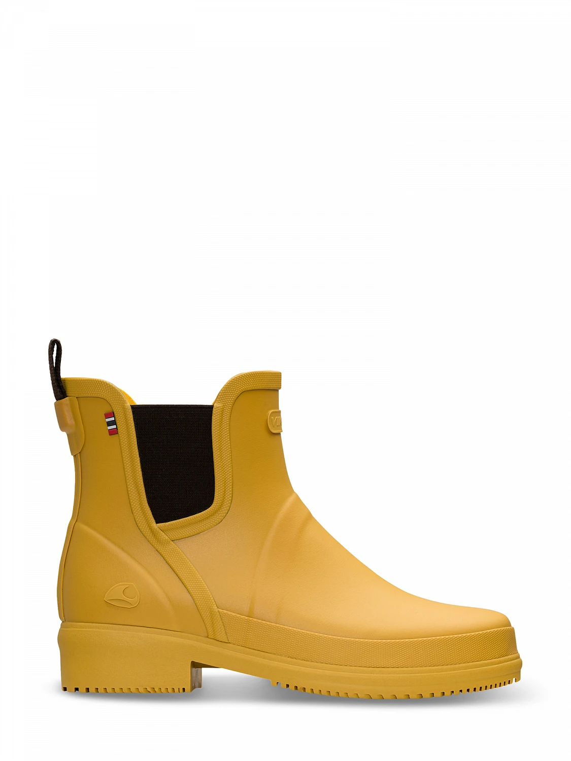 Gyda er en urban gummistøvel med en lav profil og ren stil som glir rett på og holder føttene tørre. Gyda er laget av lett gummi (LWR), som gir økt fleksibilitet og lette skritt. Et glatt polyesterfôr på innsiden gir komfort, og den avtagbare innersålen har en ergonomisk design for buestøtte og bedre demping. De elastiske sidepanelene gjør den enkel å ta på og gir komfortabel bevegelse, mens den solide sålen garanterer utmerket grep i vått vær.
